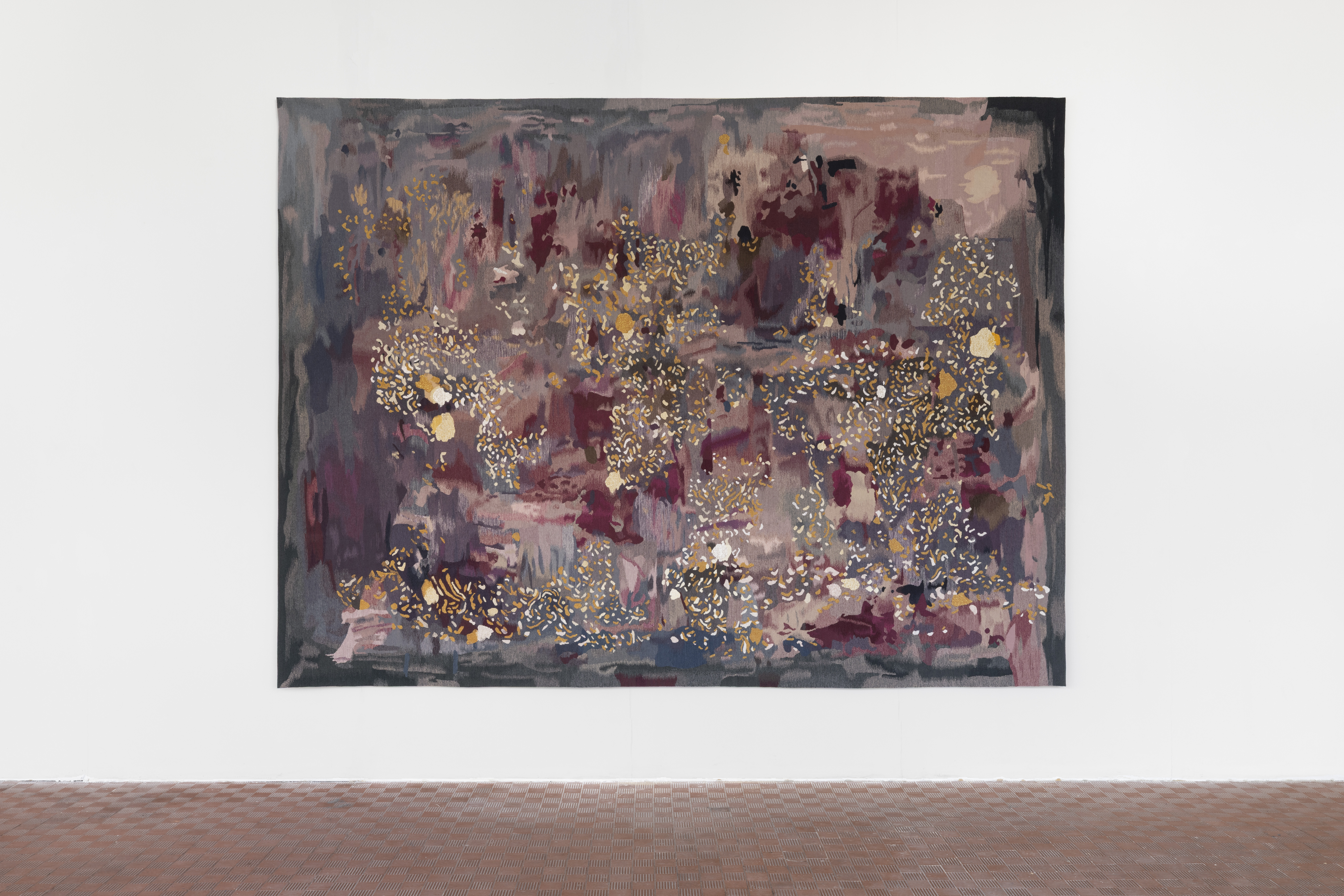 For about ten years, Rheingantz has developed a body of textile works, initially through embroidery and more recently through intricate jacquard weaves, revealing parallels between her painting technique and embroidery. In both, the artist employs a rhythmic gestural approach, which in her canvases translates into a surface animated by lines and patches of color that act as volumes and masses.