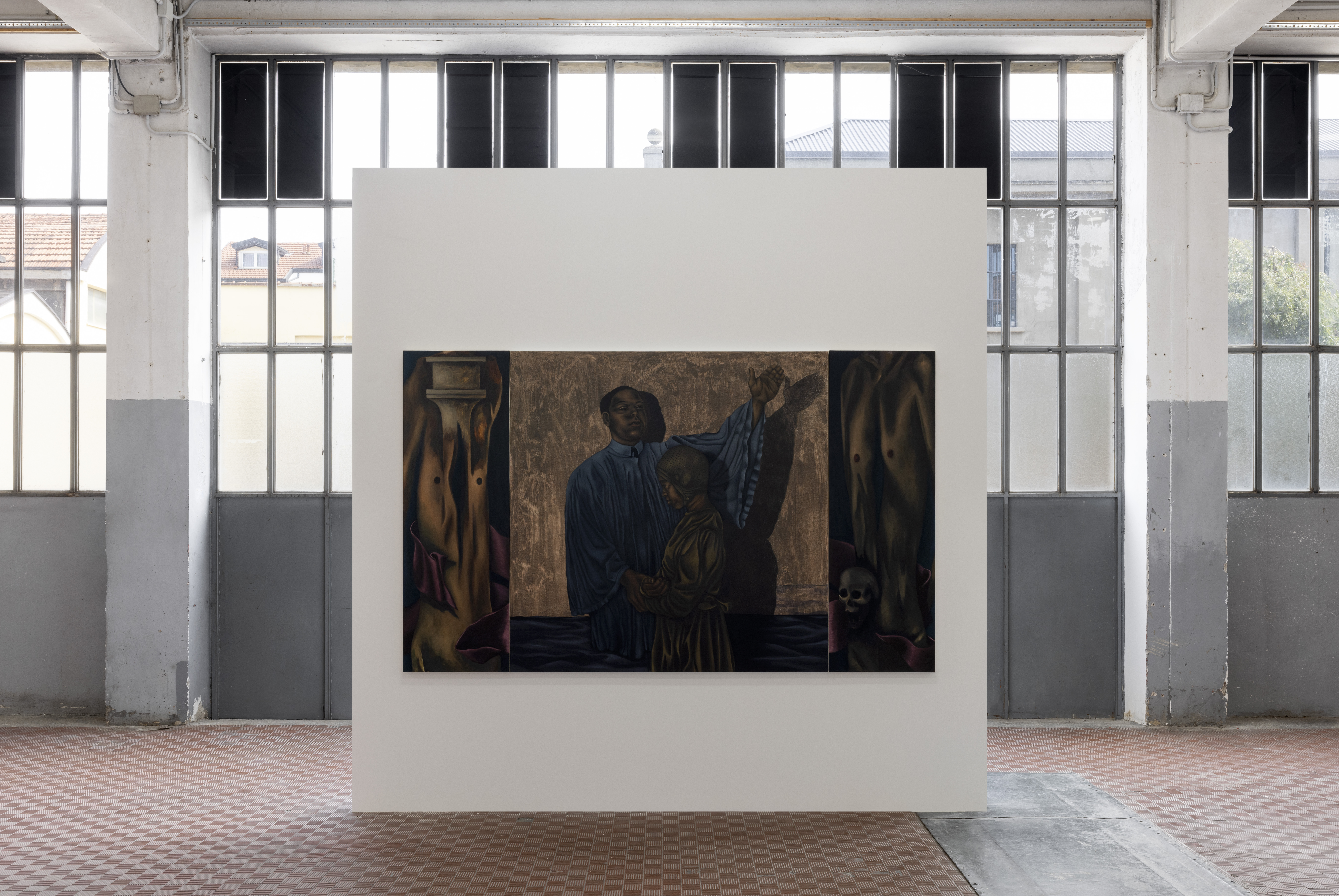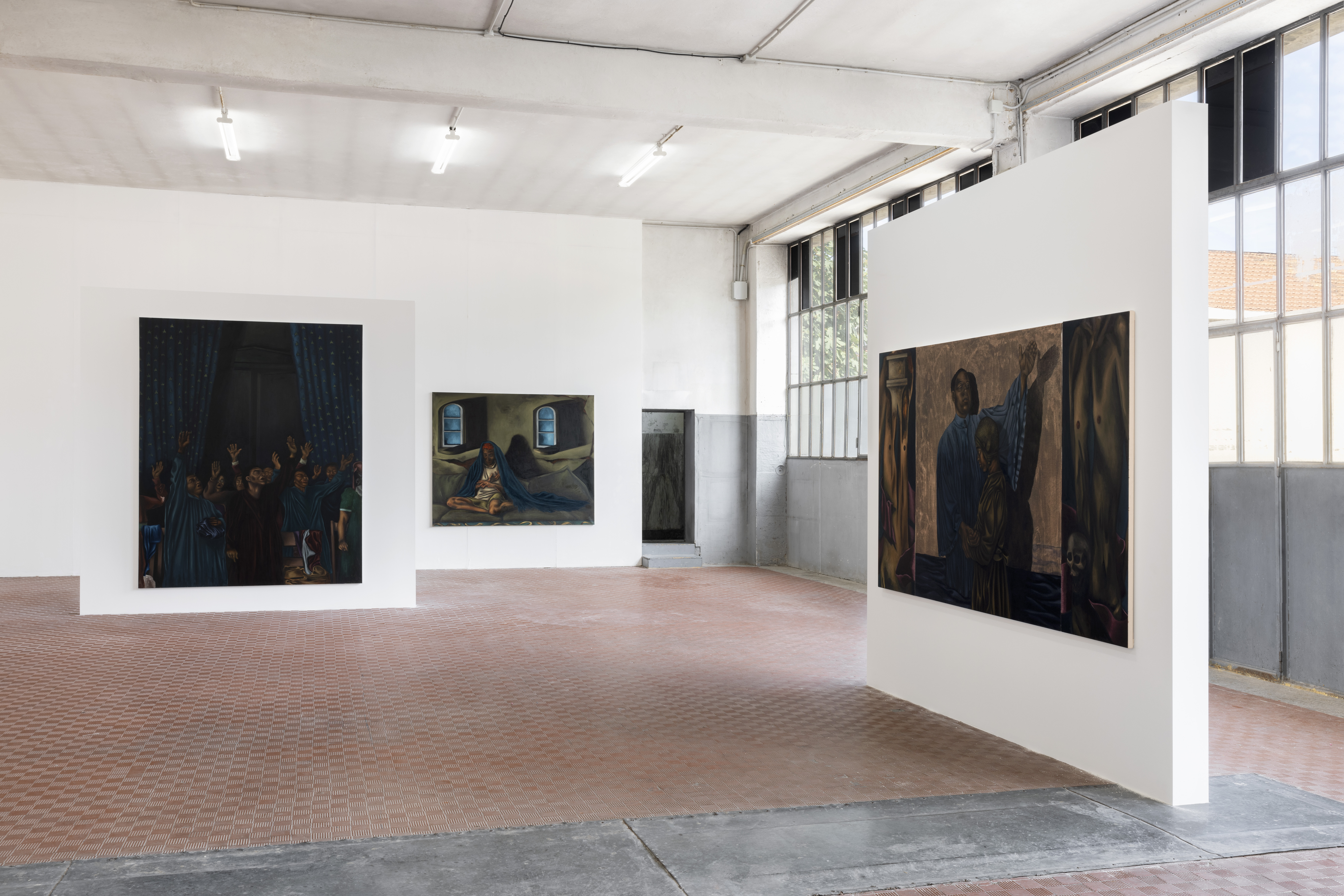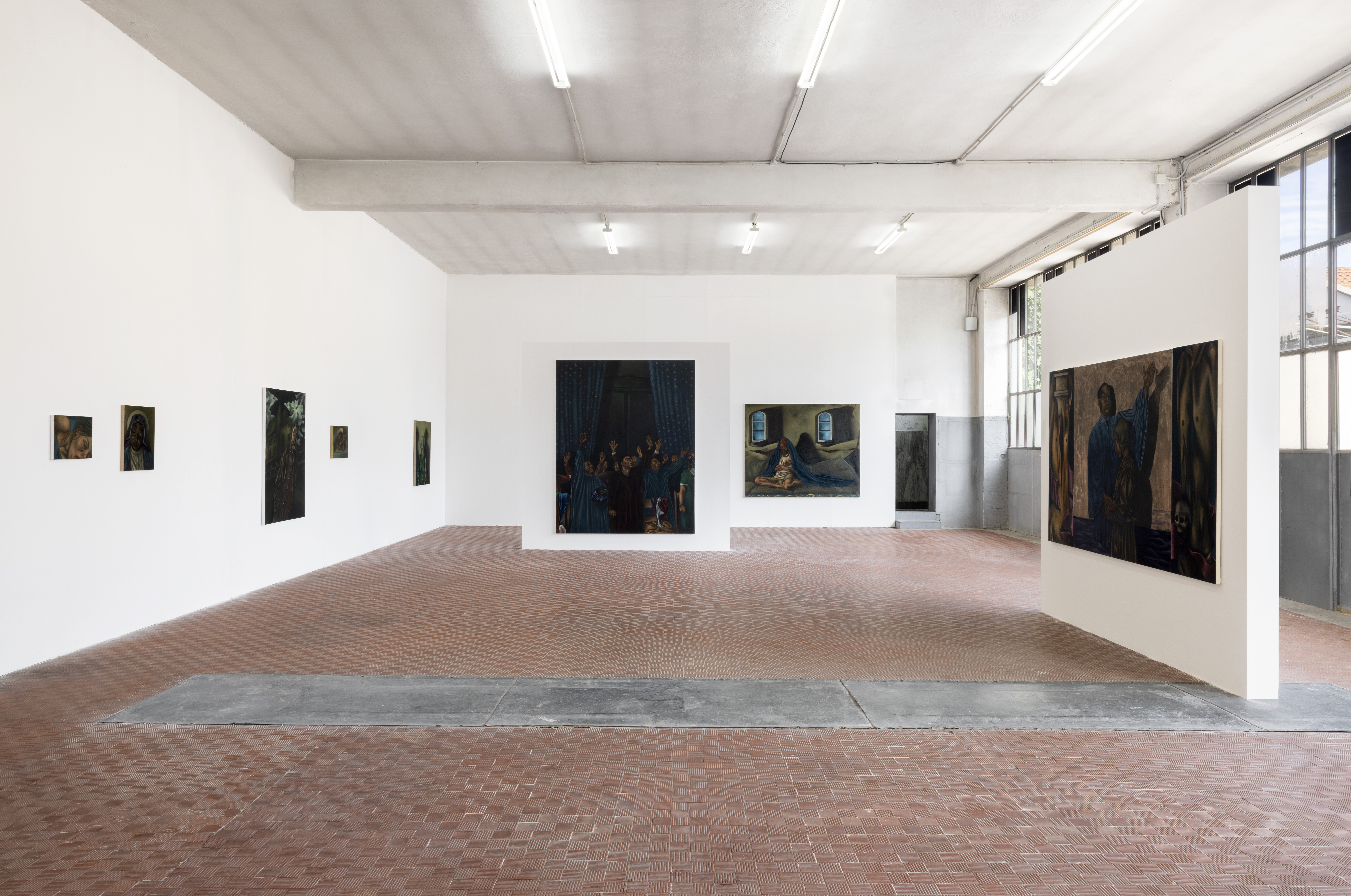 La storia della pittura e il rapporto con la fede – intesa nella sua accezione trasformativa e sociale – sono i soggetti attorno ai quali prendono forma i dipinti realizzati da Hammond, la maggior parte concepiti appositamente per la mostra tra il 2024 e il 2025. Le opere infondono allo spazio atmosfere visionarie e surrealiste: colori cupi, corpi distorti, soluzioni formali sospese tra fragilità corporea ed emotiva si accompagnano a temi quali maternità, religione, speranza e individualismo.