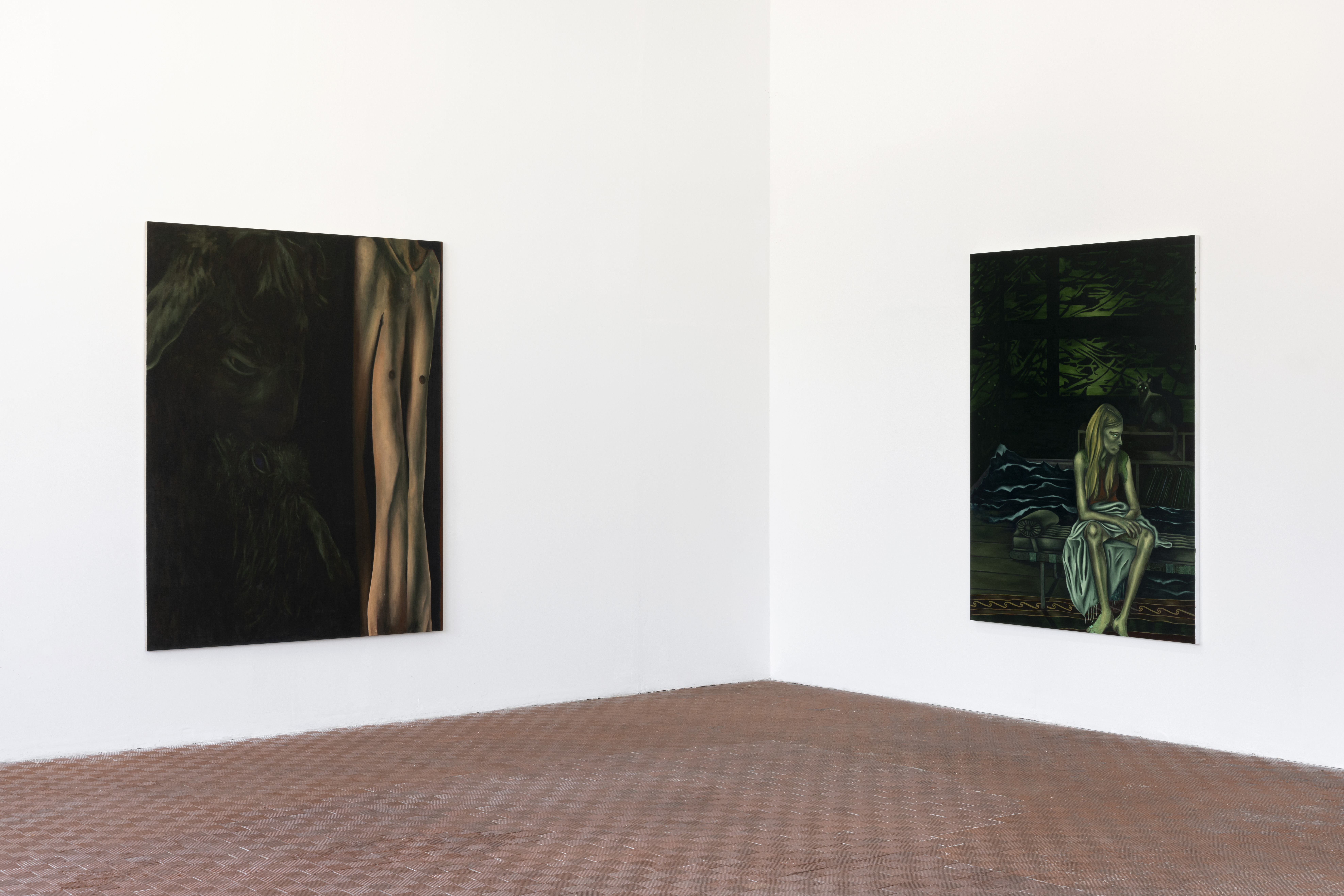 The exhibition is developed in the Foundation’s ground-floor hall, where the artist has intervened with structural alterations that actively contributes to influence the emotional perception of the works. Two partition walls disrupt the spatial and narrative linearity, while the colors and lighting amplify the emotional impact of the canvases, suggesting an introspective and psychological reading.