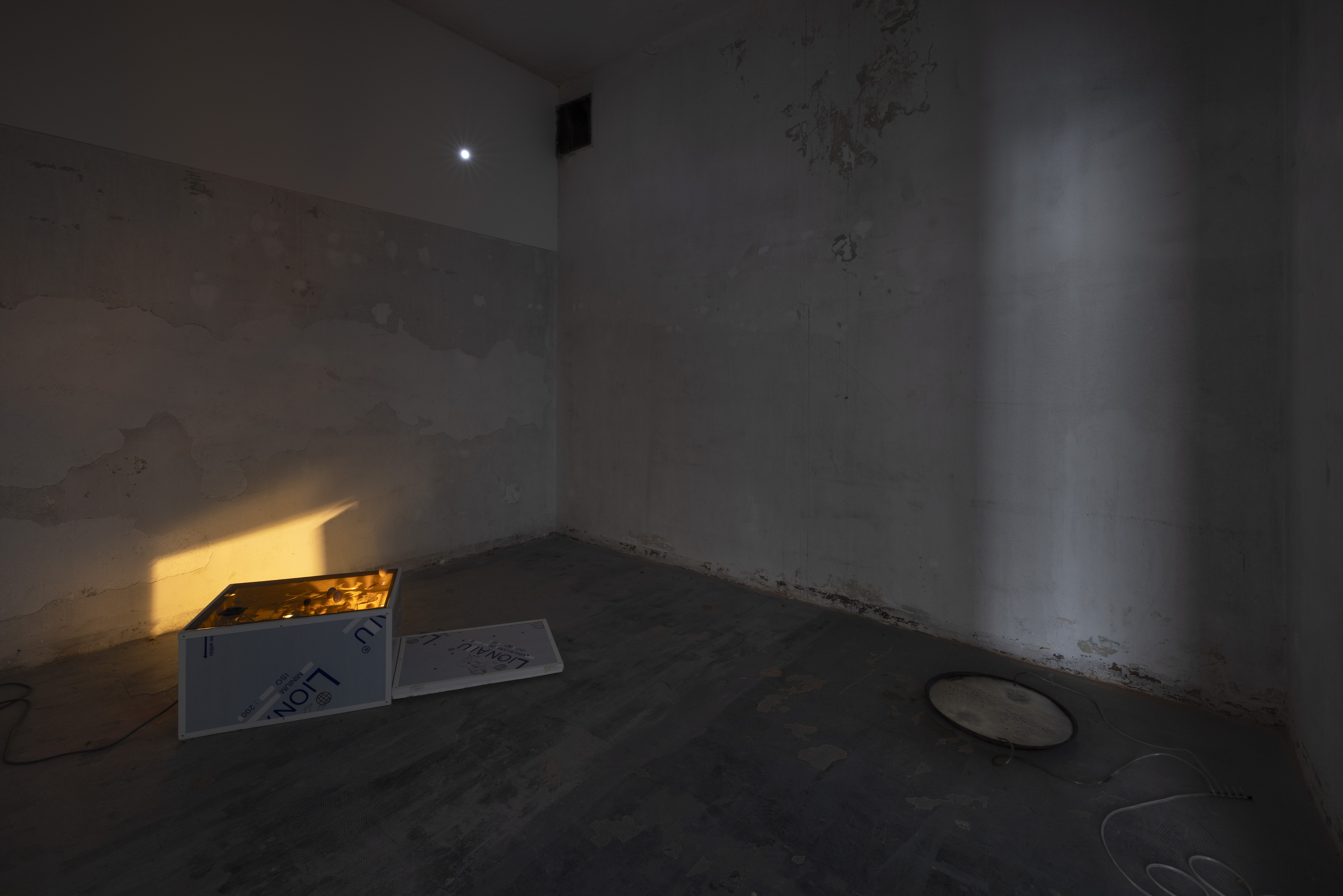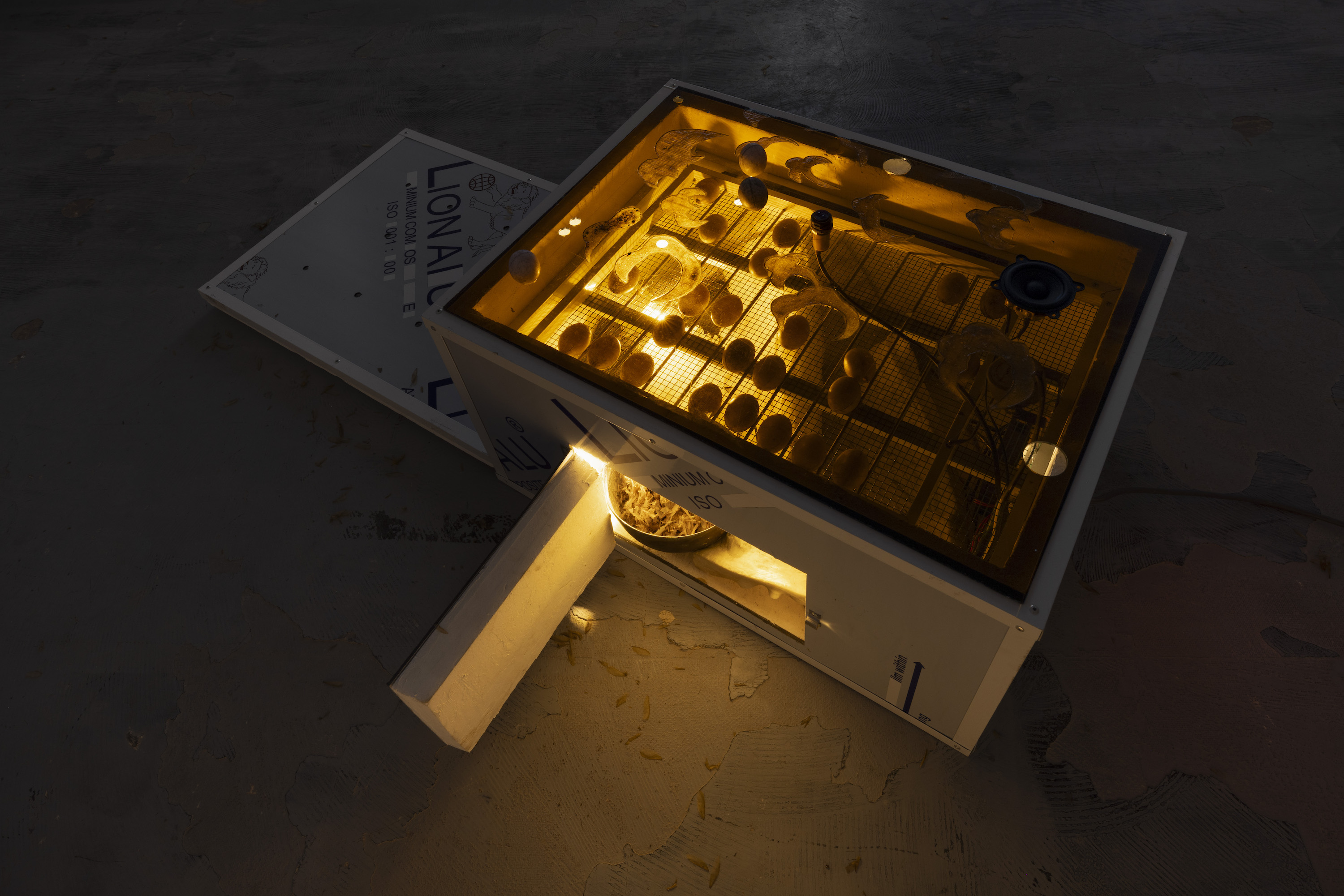 Dancing at the Edge of the World si apre con The secret code... di Trương Công Tùng (1986, Vietnam), un’installazione immersiva che intreccia oggetti artificiali ed elementi naturali, spingendo l’immaginazione verso altri mondi, umani e non. Nell’immergere il pubblico in un universo effimero dove tempo e spazio si infrangono e si compenetrano, gli elementi che compongono l’opera – uova di piccione artificiali, un’incubatrice industriale, ali di termiti, una tanica piena d’acqua nera– funzionano non solo come materiali ma anche come meccanismi di vita capaci di sollevare interrogativi sul rapporto tra gli es- seri umani e i sistemi biologici che essi costruiscono e influenzano.