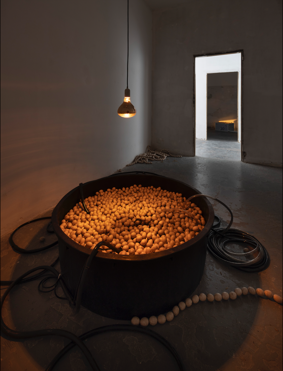 Dancing at the Edge of the World opens with The secret code... by Trương Công Tùng (1986, Vietnam), an immersive installation that inter- twines artificial objects and natural elements, expanding the imagination toward other worlds—both human and non-human. By immersing the audience in an ephemeral universe where time and space fracture and interpenetrate, the components of the work—artificial pigeon eggs, an industrial incubator, termite wings, and a canister filled with black water— function not only as materials but also as life mechanisms that provoke questions about the relationship between humans and the biologi- cal systems they create and influence.