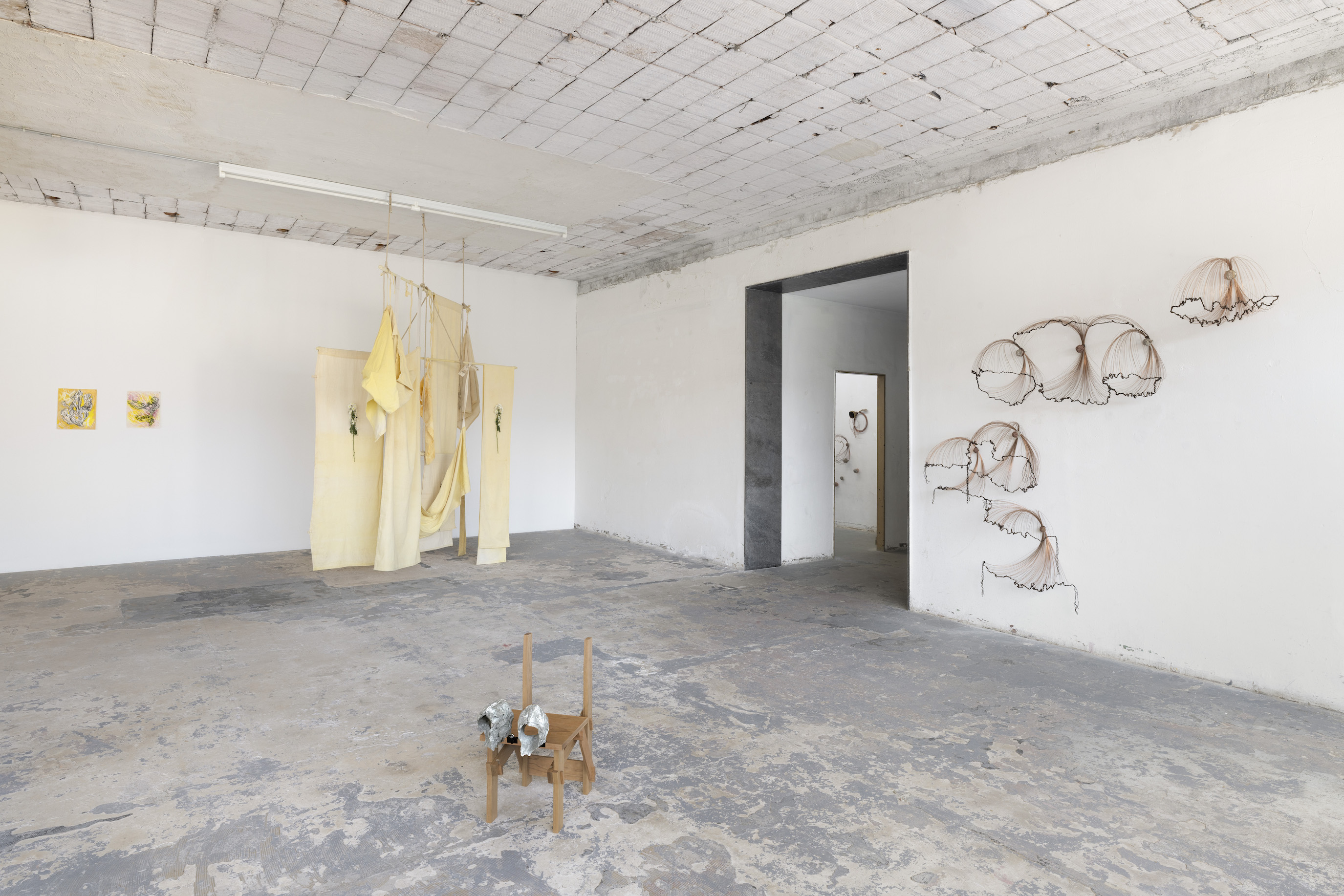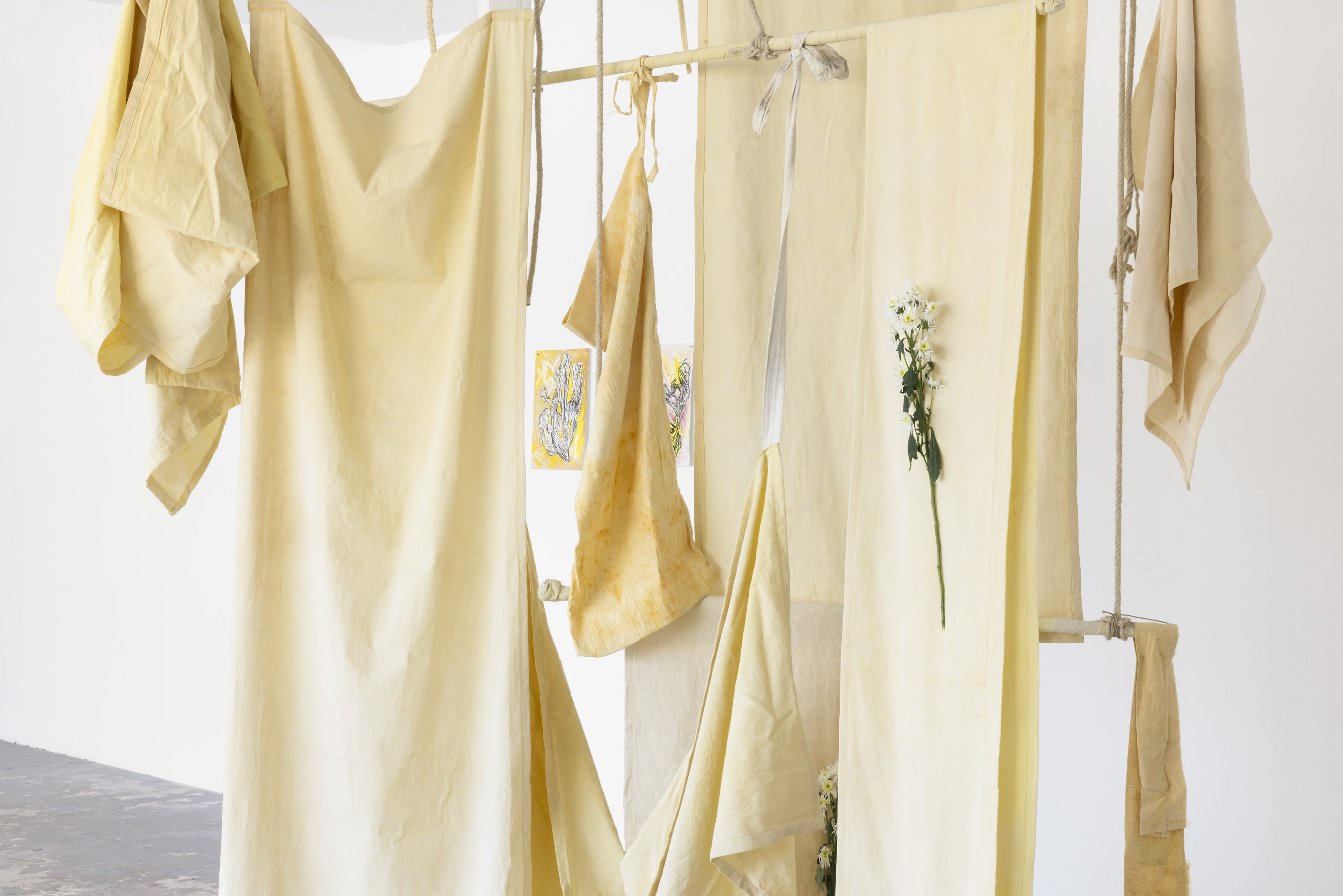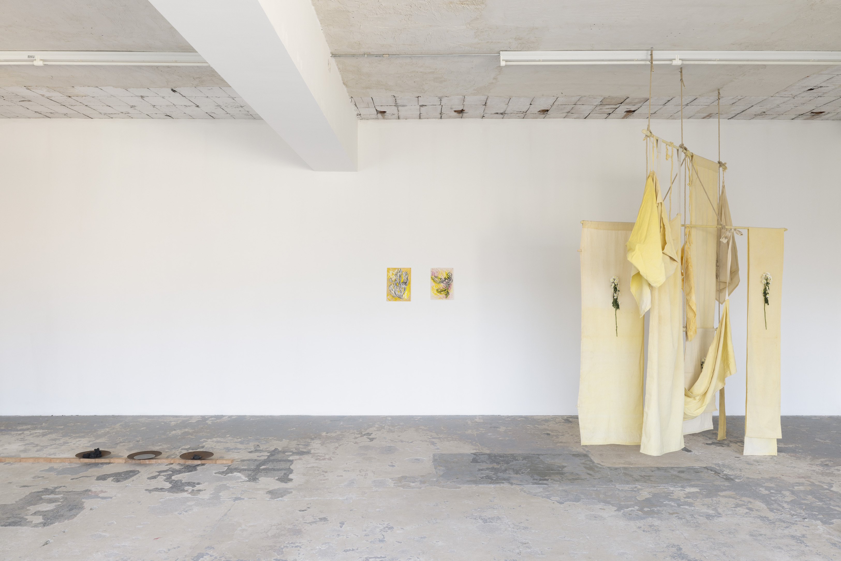 is created through the partial reuse and re-configuration of previous installations. The sculpture, composed of turmeric-dyed fabrics adorned with clusters of flowers, establishes an organic relationship in which everything— including the audience and the surrounding environment—plays a role. Concurrently, Lie’s practice extends to drawing with the series The Reek Testimonial. These drawings serve both as intimate studies and conceptual pre-cursors to the installation, translating processes of fermentation, decay, and growth into an immediate and tactile visual language using watercolor, gouache, and soft oil pastels.