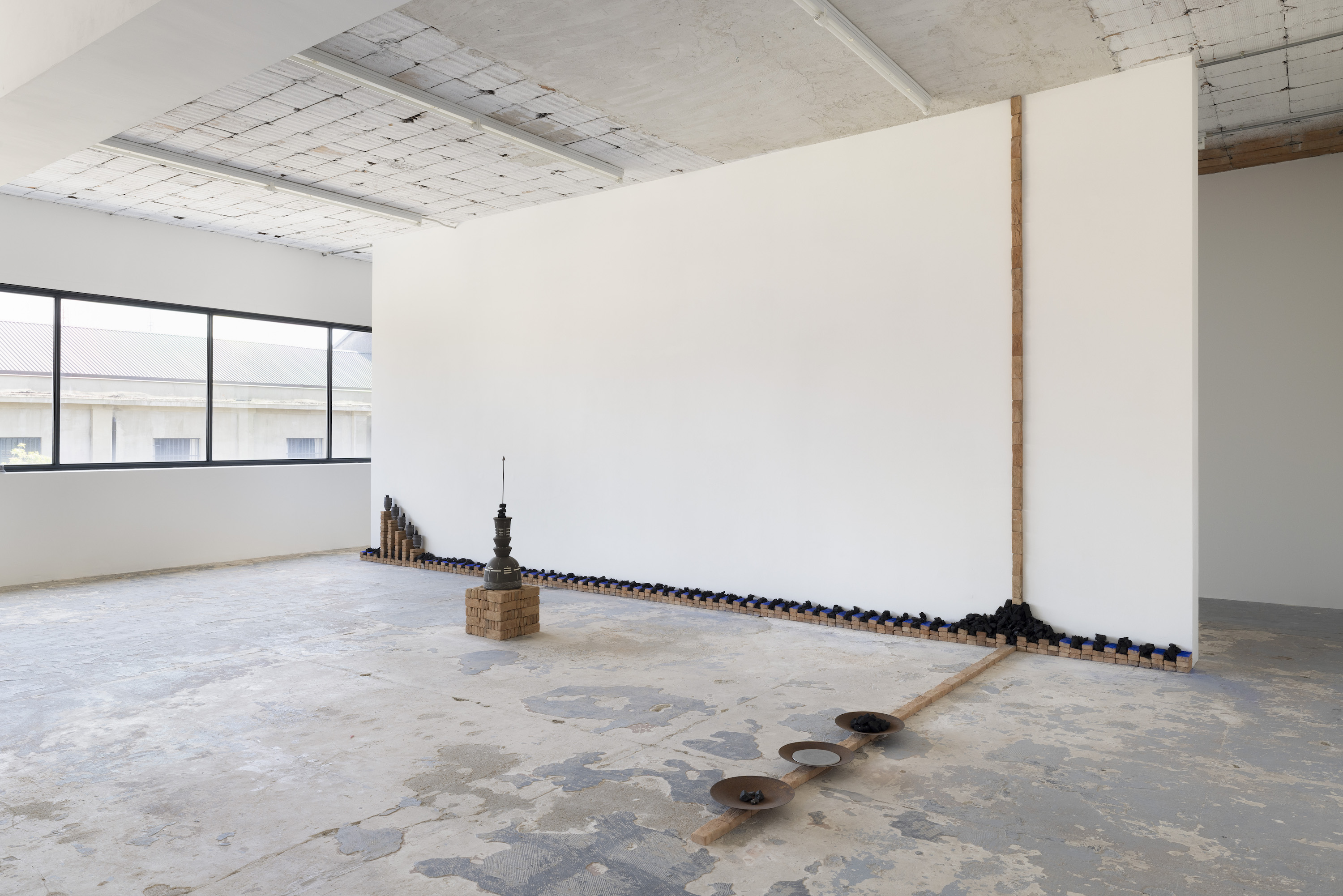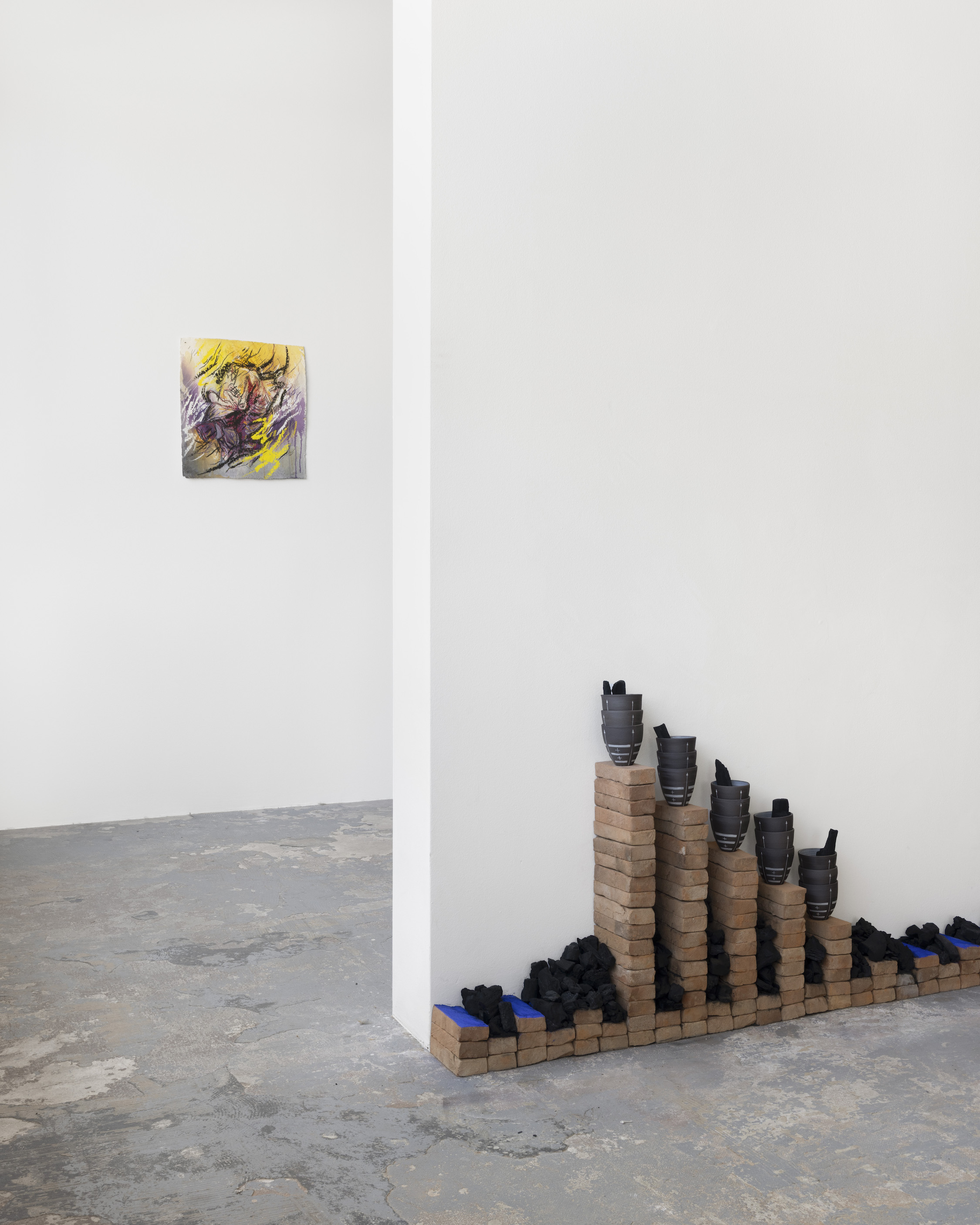 For Luana Vitra (1995, Brazil), the connection to her place of origin—the territory of Minas Gerais—and the recognition of the spiritual and subjective dimensions inherent in certain materials are fundamental to her practice. Birth Calculation – Variation 2 (2026) offers an alchemical reflection on processes of material transformation, revealing an almost sacred rituality in the arrangement of its components, among which the blue Wagi powder, a symbol of spirit, visually dominates.